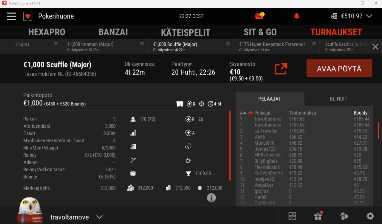 OsallistujaEilen sain pyttytilin avattua laskujeni mukaan pisteen arvoisella suorituksella: