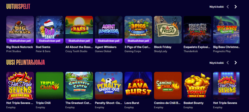 Pelivalikoima kasinolla oli mielestäni monipuolinen ja sitä oli helppo selata. Päämenun lisäksi peliaulaa selaamalla löytyi lisää alakategorioita. Itseäni miellytti mm. bonusosto- ja uutuuspelit.