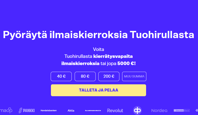 Tuohi on Trustly-pikakasino, joka mahdollistaa pelaamisen 1 euron talletuksella – sillä saat meidän kautta eksklusiivisesti 50 ilmaiskierrosta. Kasinon suurin vetonaula on kuitenkin Tuohirulla, jonka palkinnoista löytyy huikeat 500 kappaletta 10€ käteiskierroksia.