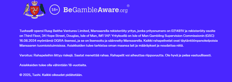 Tuohi Casino on luotettava, koska sillä on Isle of Man Gambling Supervision Commissionin (GSC) myöntämä lisenssi. Mansaaren OGRA-lisenssi takaa muun muassa riittävän korkeat palautusprosentit, riitatilanteissa auttamisen sekä vastuullisen pelaamisen työkalut.