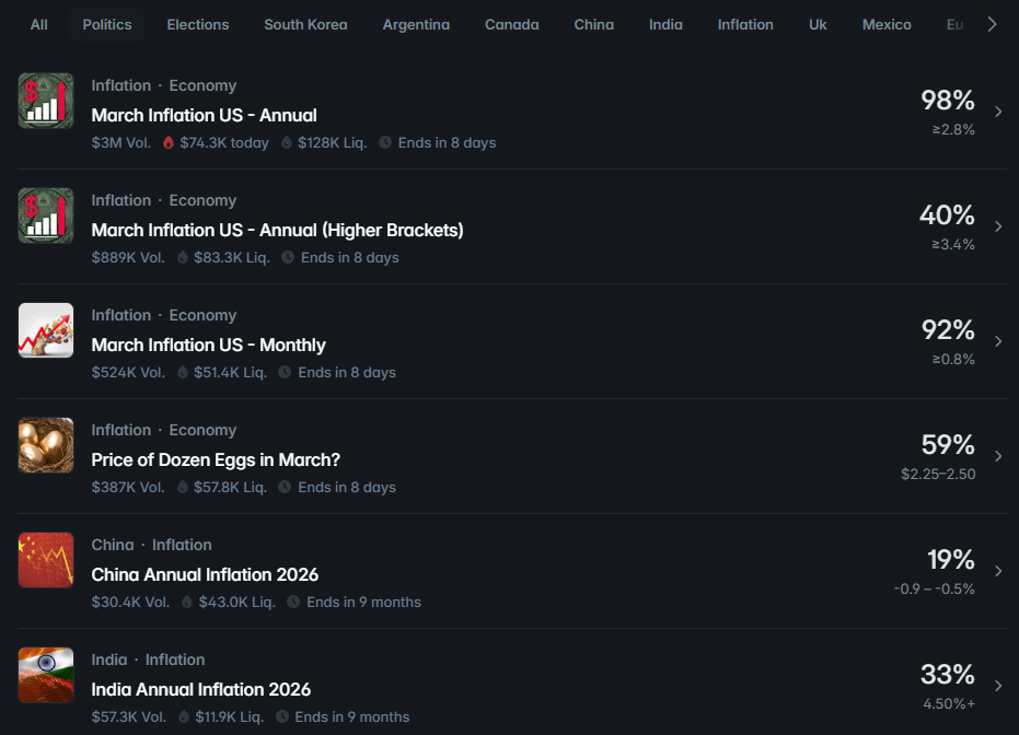 Polymarketissa on auki lukuisia kohteita muun muassa eri alueiden inflaation kehityksestä.