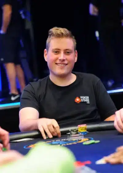 Mies istuu pokeripöydässä päällään musta huppari. Miehellä on vasemmassa kädessään hopeinen rannekello. Pöydällä on pelimerkkejä.