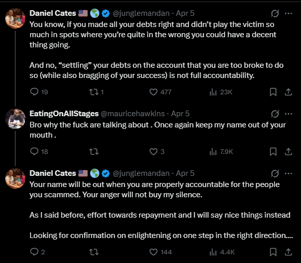 Cates on vaatinut Hawkinsia maksamaan väitetyt velkansa, joiden katsotaan tahraavan pelaajan mainetta huolimatta jatkuvasta turnausmenestyksestä. Kritiikki ei kuitenkaan vaikuttanut hidastavan Hawkinsia, joka vastasi molemmille huippupelaajille asiattomaan tyyliinsä.