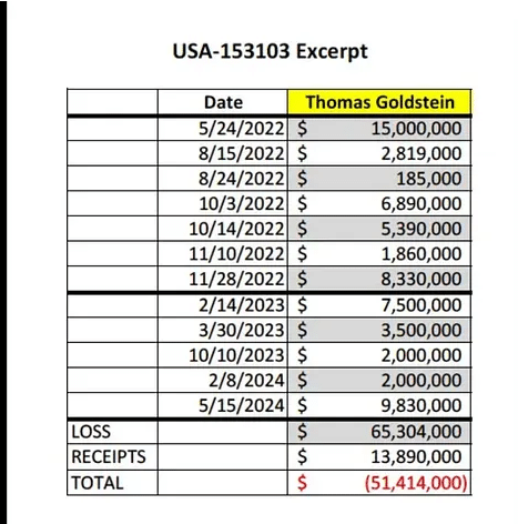 Ensimmäinen rahasiirto tapahtui toukokuussa 2022, jolloin Goldstein kuittasi 15 miljoonan dollarin maksun. Tämän jälkeen seurasi useita valtavia voittoja, kuten 8,3 miljoonaa marraskuussa 2022, 7,5 miljoonaa helmikuussa 2023 ja peräti 9,3 miljoonaa toukokuussa 2024.