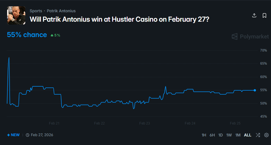 Tällä hetkellä markkina arvioi Antoniuksen voittomahdollisuudeksi 55 %, vaikka luku kävi korkeimmillaan jo 68 prosentissa.
