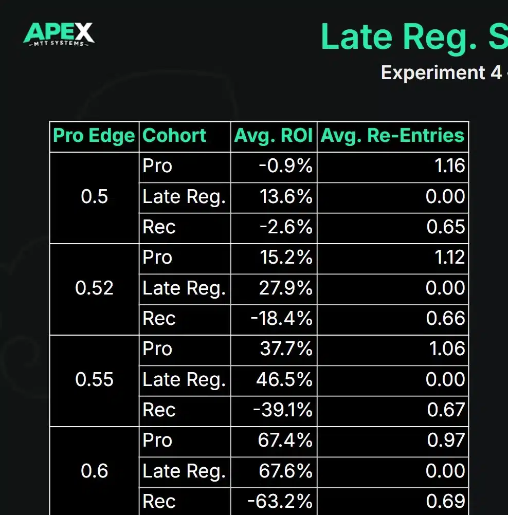 Hänen luomansa tietokonemallin mukaan maksimaalinen ”late reg” voi lähes kaksinkertaistaa voitollisen pelaajan sijoitetun pääoman tuoton (ROI), olettaen, etteivät kaikki muutkin ammattilaiset tee samoin.