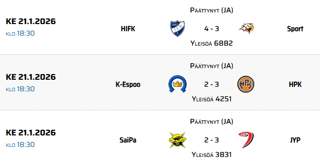 Kierroksella pelasivat Kiekko-Espoo–HPK, SaiPa–JYP sekä HIFK–Sport.