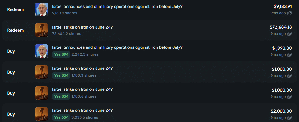 Erillisessä kohteessa, jossa lyötiin vetoa siitä, syrjäytetäänkö Ayatollah Ali Khamenei vallasta, vaihto nousi peräti 150 miljoonaan dollariin. Vaikka tällainen vedonlyönti toimii Israelissa, sekä monessa muussa maassa juridisesti epäselvällä alueella, sen suosio on kasvanut räjähdysmäisesti kryptovaluuttojen myötä.