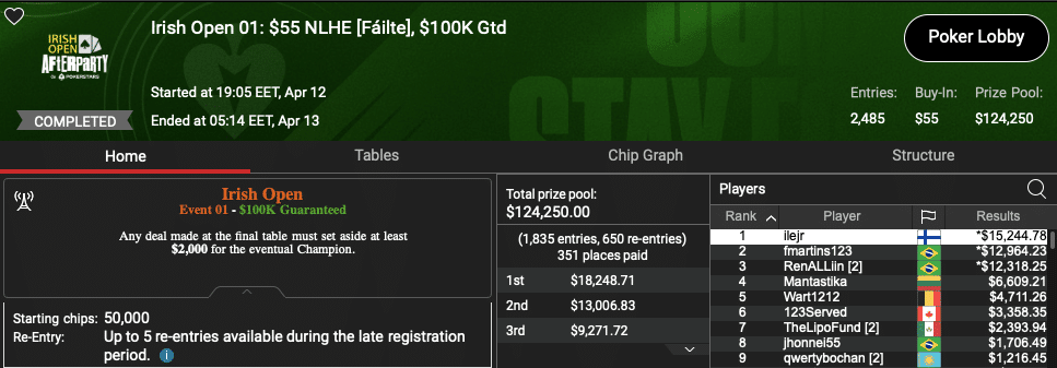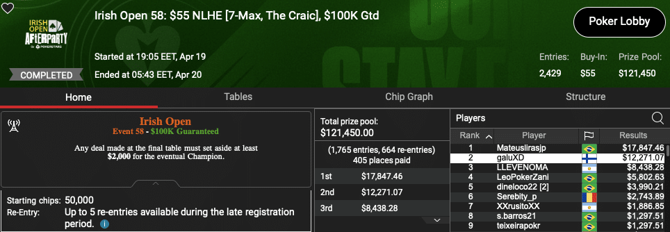 Menestys ei kuitenkaan rajoittunut pelkkiin livepöytiin, vaan sitä tuli myös netissä PokerStarsilla pelatussa Irish Open Afterparty -turnaussarjassa.