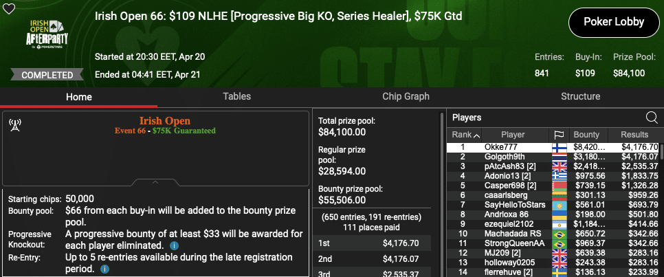 Muun muassa ”Okke777” nousi korkeimmalle palkintopallille 109 dollarin Progressive Bounty -turnauksessa. Turnaus keräsi 841 osallistujaa, joten kokonaispalkintopotti nousi hieman yli 84 000 dollariin. Suomalainen kuittasi voitostaan bountyineen 12 596 dollaria.