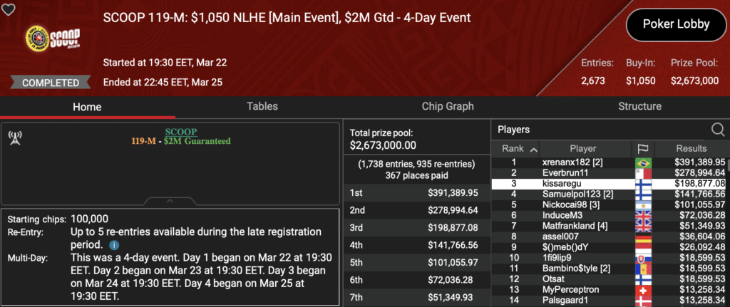 Tällä kertaa voitto jäi kuitenkin muutaman sijan päähän. Nimimerkki ”Samuelpol123” sijoittui neljänneksi ja kuittasi 141 766 dollaria. Heti perässä maatoveri ”kissaregu” nousi kolmanneksi ja ansaitsi 198 877 dollaria. Suomeen kertyi tästä turnauksesta yhteensä noin 340 000 dollaria rahastuksia, ja voidaan todeta, että SCOOP-turnaussarja oli kokonaisuudessaan suomalaisten kannalta vahva ja menestyksekäs.