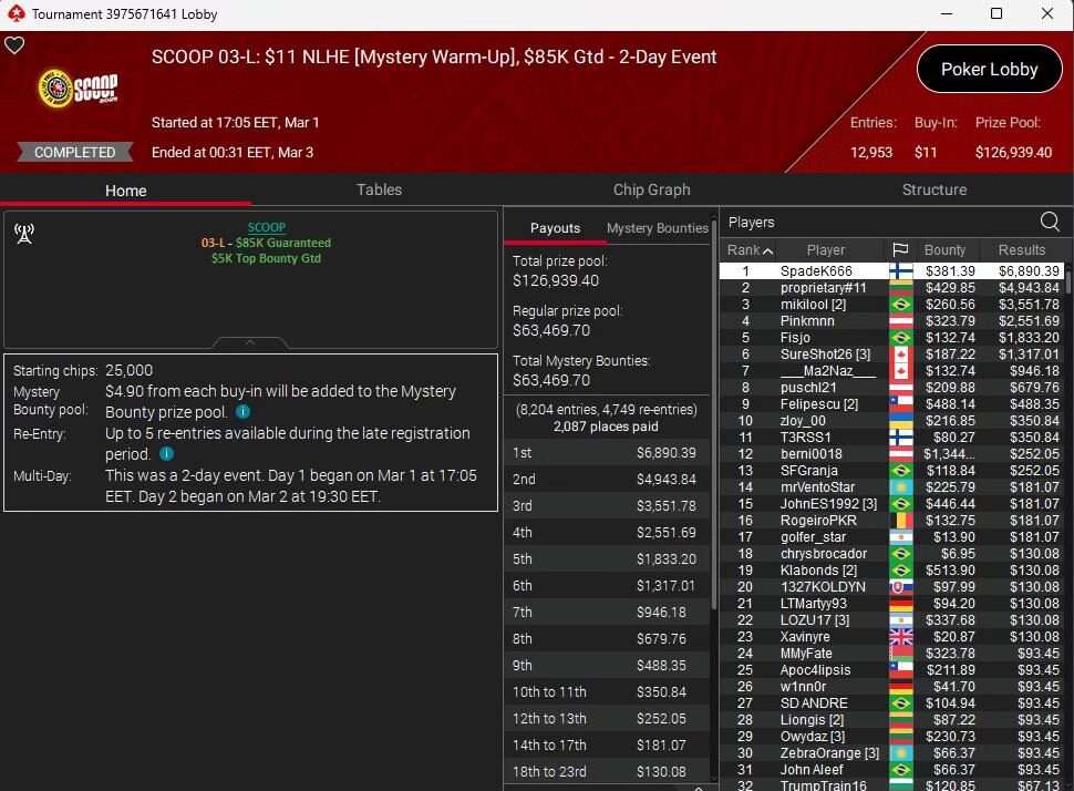 Turnaus keräsi peräti 12 953 sisäänostoa, mikä nosti palkintopotin 126 939 dollariin. Pitkän ja vaiherikkaan taistelun jälkeen “SpadeK666” piti pintansa ja varmisti mestaruuden.