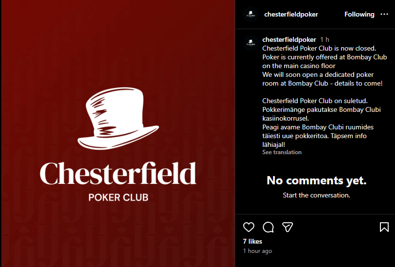 Tallinnan pokerskenestä saatiin torstaina uutisia, kun kaupungin uudempiin pelipaikkoihin kuulunut Chesterfield Poker Club on ilmoittanut Instagram-tilillään toiminnan loppuneen.