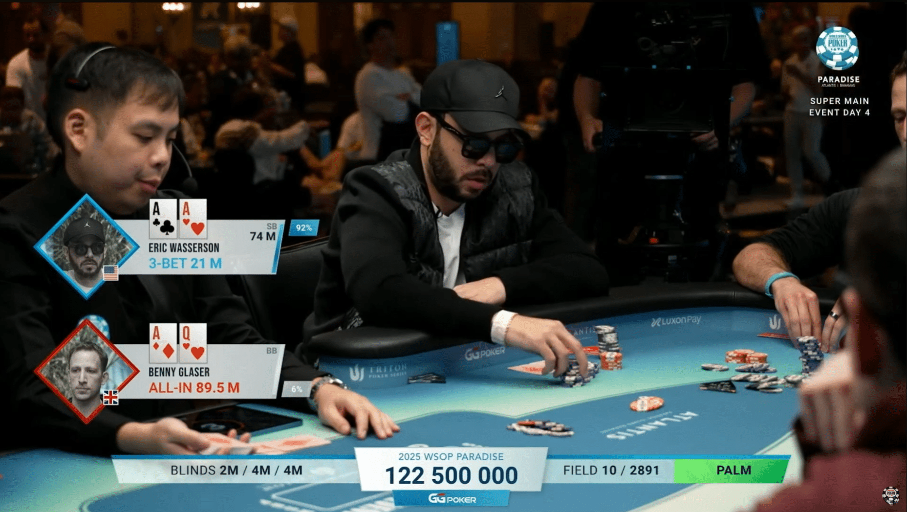 Tässä vaiheessa Britannian pokeritähti Benny Glaser, jolla oli yksi pöydän pienimmistä pinoista, päätti puskea kaikki merkkinsä keskelle. Glaserin kädestä löytyi A♦Q♥.