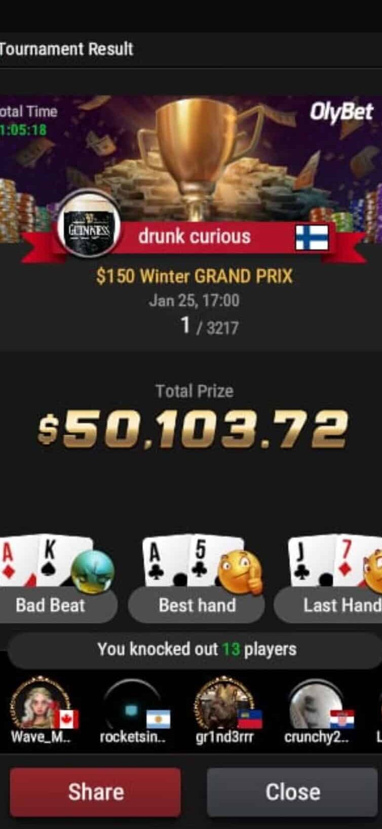 3 217 pelaajan turnauksesta irtosi ykkössija ja 50 103 dollarin palkintorahat. Rinne kertoo, että kyseessä on hänen tähänastisen uransa suurin nettirahastus.