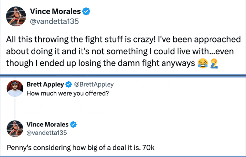 Nyt UFC-veteraani Vince Morales on paljastanut, että ongelma saattaa olla laajempi. Morales kertoi sittemmin poistetussa X-viestissään, että hänelle oli tarjottu 70 000 dollaria ottelun tarkoituksellisesta häviämisestä.