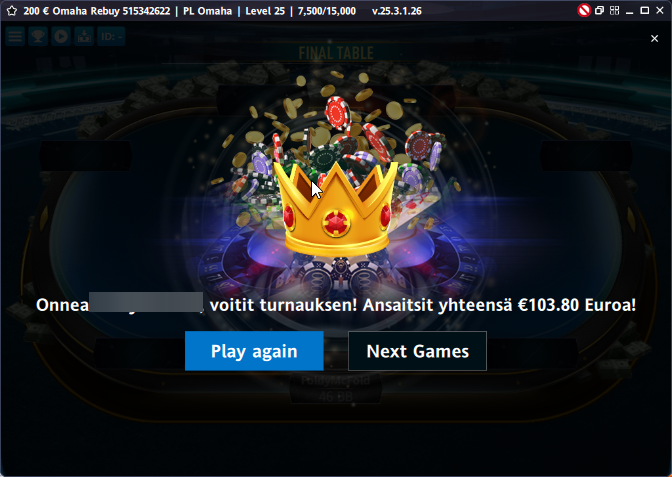 Yölliset pelitykset jälleen vain muistona takanapäin. Alkuilta meni aika mollivoittoisesti ja pöydät katoili tuon tuosta. Muutama kirvelevä suora bubble tarttui kans kalan katiskaan, mutta Kuinka ollakkaan 3r plo kolmas ilta putkeen vedettiin huppiin ja toinen ilta putkeen otettiin  kannu :yahoo:   Ei taidolla, vaan tuurilla :yahoo: