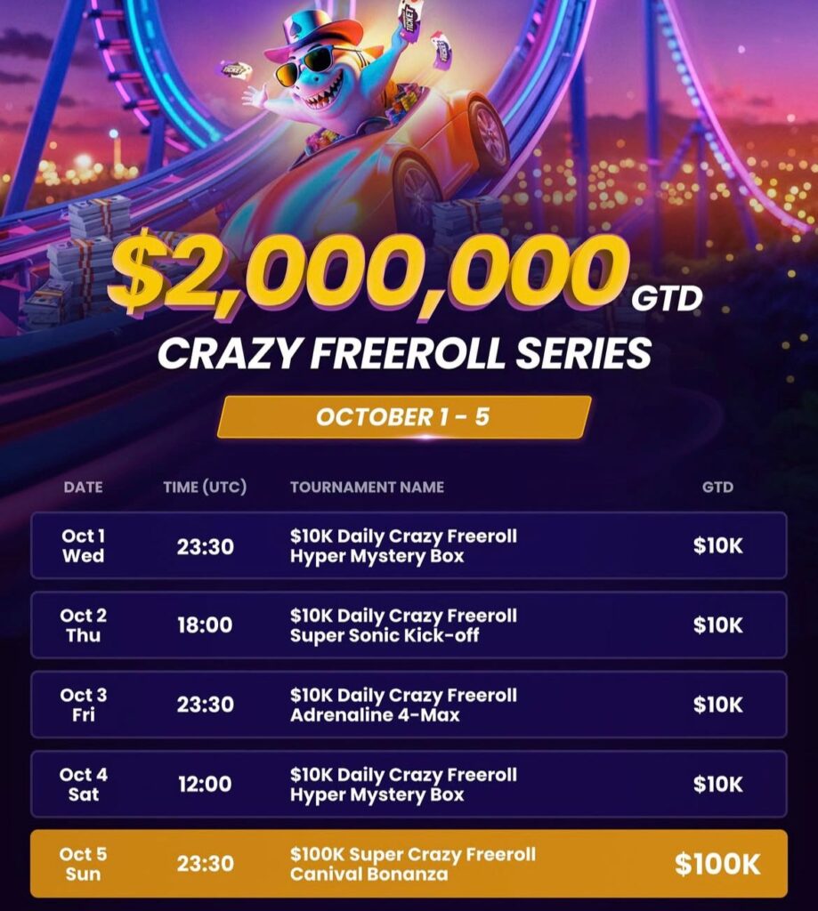 - Sunnuntaisin: $100K Super Crazy Freeroll – viikon kohokohta, jossa on palkintopotissa 100,000 dollaria.