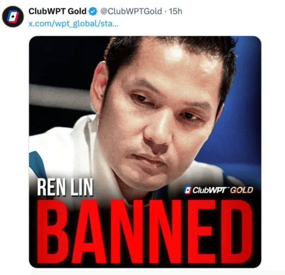 Soppa sakeni entisestään, kun WPT:n sweepstakes-pelejä Pohjois-Amerikassa tarjoava ClubWPT Gold liittyi keskusteluun julkaisemalla kuvan Ren Linistä varustettuna isolla ”BANNED”-leimalla.